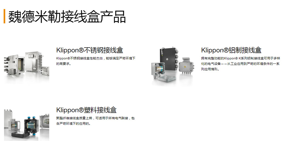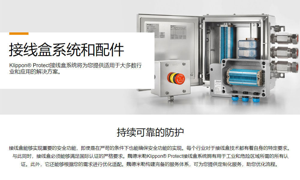 接线盒能够实现重要的安全功能,即使是在严苛的条件下也能确保安全功能的实现。每个行业对于接线盒技术都有着自身的特定要求。与此同时,接线盒必须能够满足国际认证的严格要求。魏德米勒Klippon® Protect接线盒系统拥有用于工业和危险区域所需的所有认证。此外,它还能够根据您的需求进行优化适配。