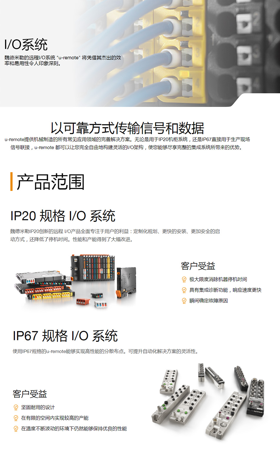 u-remote提供机械制造的所有常见应用领域的完善解决方案。无论是用于IP20机柜系统,还是IP67直接用于生产现场信号联接,u-remote 都可以让您完全自由地构建灵活的I/O架构,使您能够尽享完整的集成系统所带来的优势。