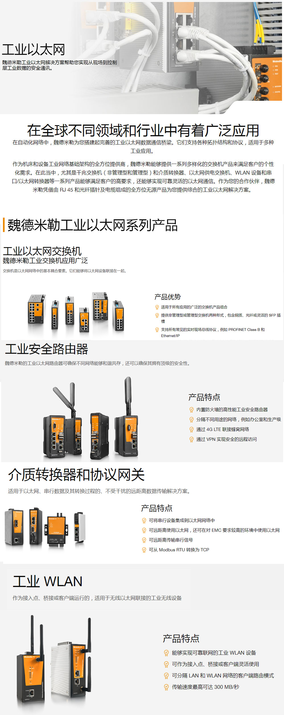 作为机床和设备工业网络基础架构的全方位提供商,魏德米勒能够提供一系列多样化的交换机产品来满足客户的个性化需求。在此当中,尤其是千兆交换机(非管理型和管理型)和介质转换器、以太网供电交换机、WLAN 设备和串口/以太网转换器等一系列产品能够满足客户的高要求,还能够实现可靠灵活的以太网通信。作为您的合作伙伴,魏德米勒凭借由 RJ 45 和光纤插针及电缆组成的全方位无源产品为您提供综合的工业以太网解决方案。