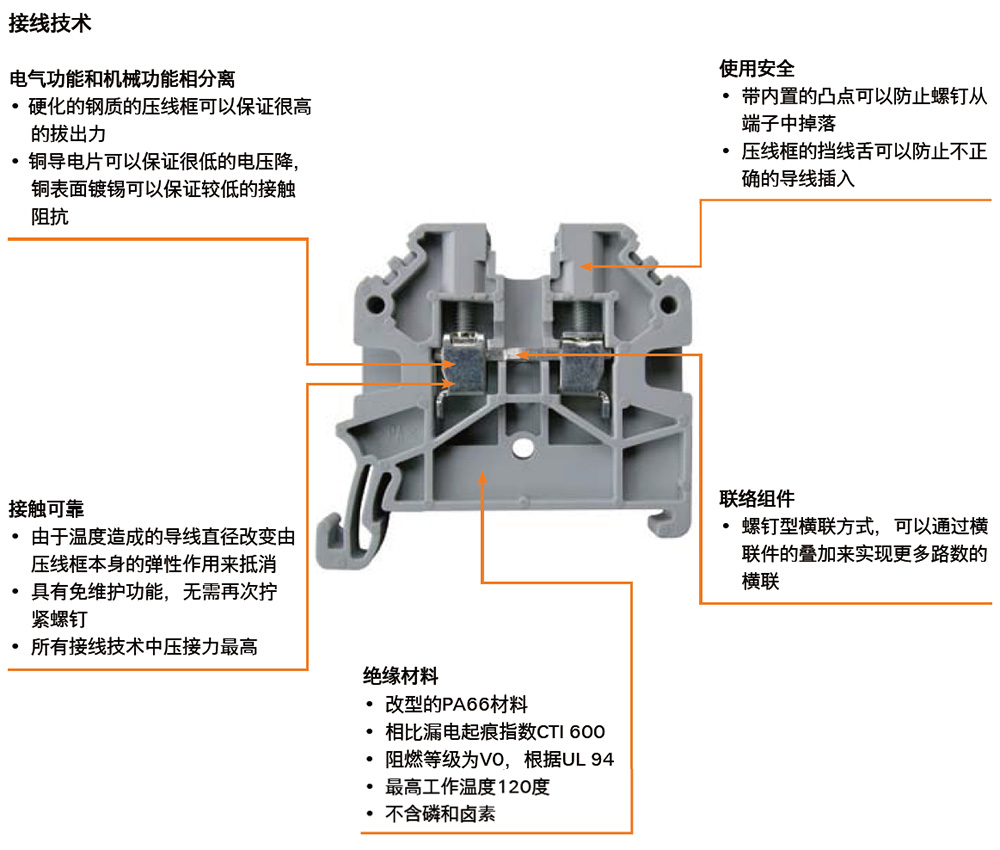 SAKDU系列接线铀子采用改型的PA66材料,具有VO阻燃等级和120度的工作溫度,经典的压线框接线技术了可靠的联接及很高的压紧力。产品的尺寸也在不降低相关电气技术参数的基础上进行了缩小,使得产品可以在更紧凑的空间里得到应用。